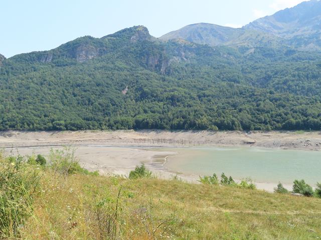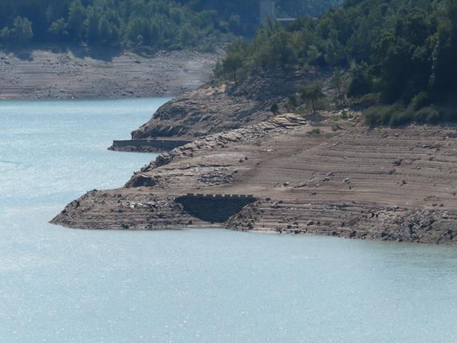 El bajo nivel del agua nos deja ver algunos quitamiedos de la antigua carretera -esos pivotes que parecen almenas en la foto-, normalmente sumergida.