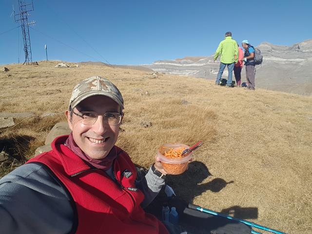 Mientras como, aparecen de la nada tres montañeros. Todo el trayecto desde Nerín hemos ido solos, salvo el cruce con unos ciclistas que subían por la pista hacia Cuello Arenas. Vienen desde la cara norte del Mondicieto, seguramente la subida la han hecho desde el refugio y luego de dirigirse al norte han doblado al oeste hasta que han hecho cima. Es otra opción.