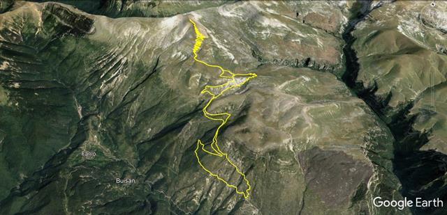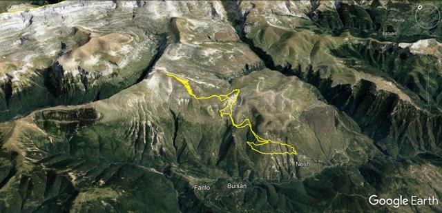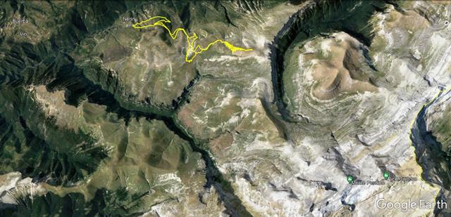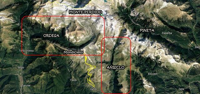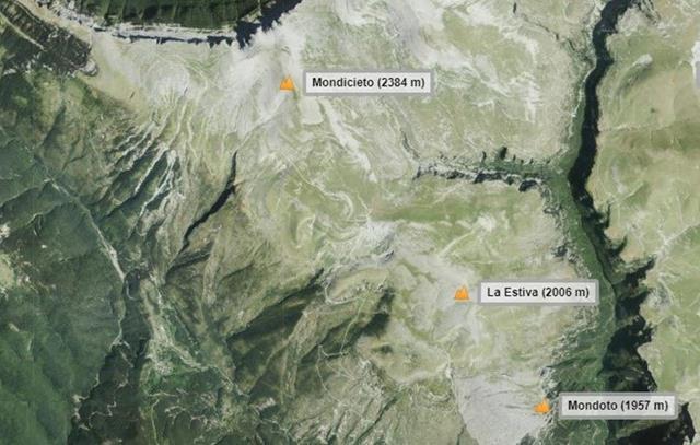 En la ortofoto que os pongo debajo, podéis ver los tres picos más sobresalientes de la zona, el Mondoto, más abajo, y que quedó a la derecha cuando tomamos la senda de Cuello Arenas, el de la Estiva, a donde ahora subiremos, y el Mondicieto. El cañón verde, esa enorme grieta que se ve a la derecha del todo es Añisclo, y el trozo verde que se ve en la parte superior de la foto, a la izquierda, es el Valle de Ordesa.