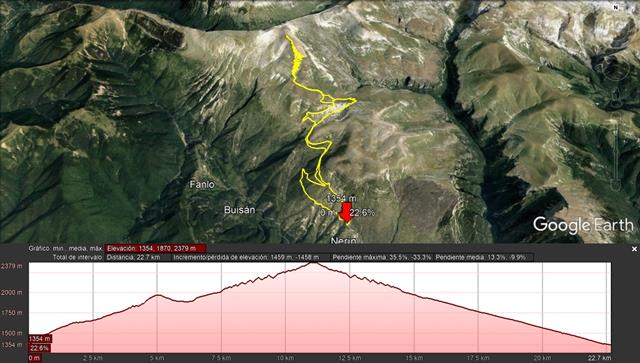 A las 16.26 horas llegamos a la pista y al cartel con indicaciones desde el que iniciamos el ascenso. Nos ha costado bajar una hora. 30 minutos menos que subir. No hemos hecho paradas. Llevamos 14,7 km desde que salimos de Nerín y casi 7,5 horas en movimiento.
