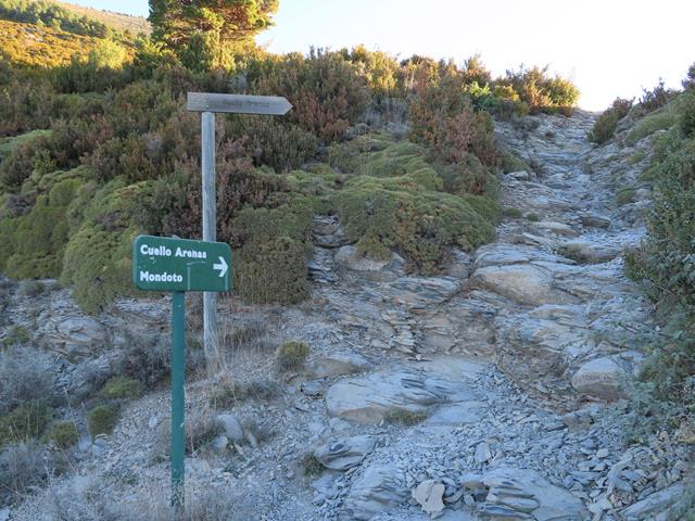 Tras diez minutos subiendo y habiendo recorrido medio kilómetro en ascenso, estamos ya a unos 1.431 de altura, -hemos salvado aproximadamente 150 m de desnivel desde el coche-. Es aquí donde nos encontramos con el desvío a Cuello Arenas. Muy bien indicado. No hay pérdida posible.