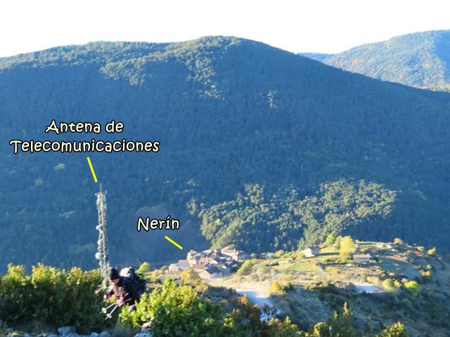Cuando llevamos 2 km de caminata, y a 1.639 m de altura,-ya hemos salvado un desnivel de 360 m- la senda sale a la pista que viene desde Nerín. Ahora avanzaremos por ella un trecho. Son las 10 de la mañana.