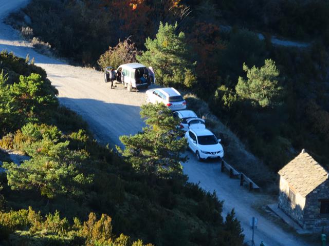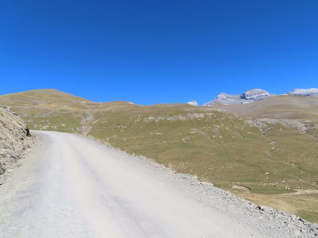 Son las 14 horas y la cima ni se ve.¿Nos está costando mucho subir?. Tal vez ya sería mejor no parar a hacer fotos y subir de un tirón. Hay que volver a Nerín y ni siquiera hemos llegado al Mondicieto. No hemos comido nada tampoco, lo íbamos a hacer en la Estiva pero lo hemos dejado para cuando hagamos cumbre en el Mondicieto. En la foto que pongo debajo, junto a la pista, hay un minúsculo cuadradito blanco, es un coche. Desde ahí venimos.
