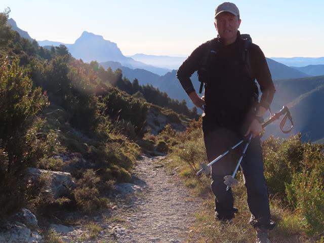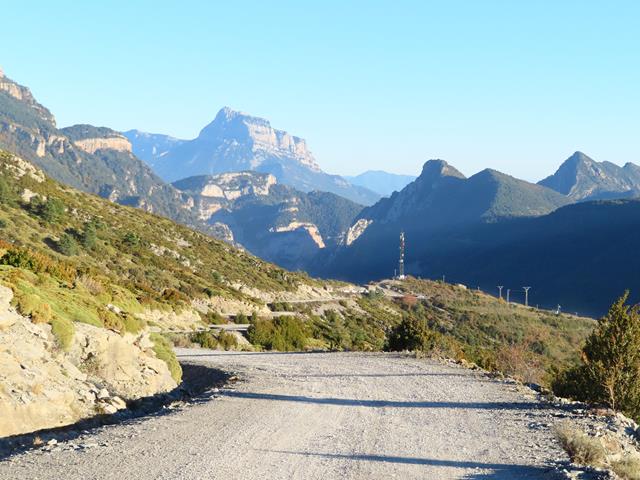 El sol ya apunta por el este e ilumina parte del camino por el que vamos subiendo. Comienza a sobrar ropa de abrigo. Nos quitamos capas. Al fondo se ve el perfil de la Peña Montañesa (2.295 m).