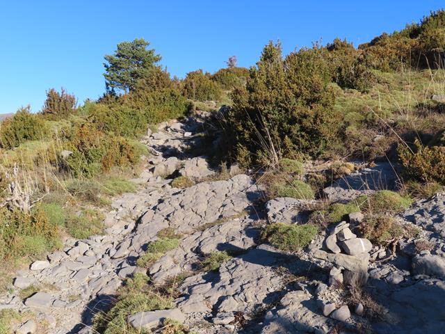 La subida es constante, vamos ganando metros rápidamente sobre el lugar donde hemos dejado el coche y sobre el propio Nerín. Este tramo es relativamente cómodo, el suelo es de roca, a veces desmenuzada, y nos rodean abundantes erizones o cojines de monja, también boj.