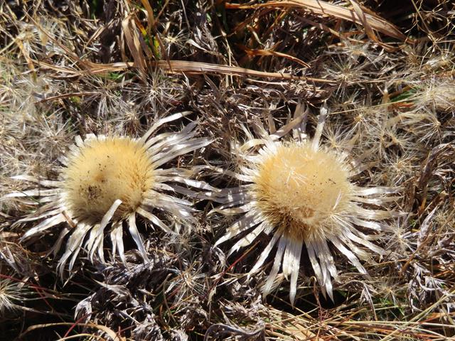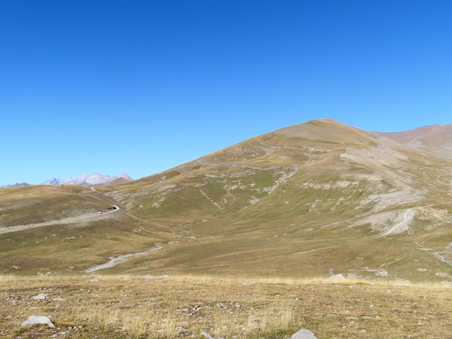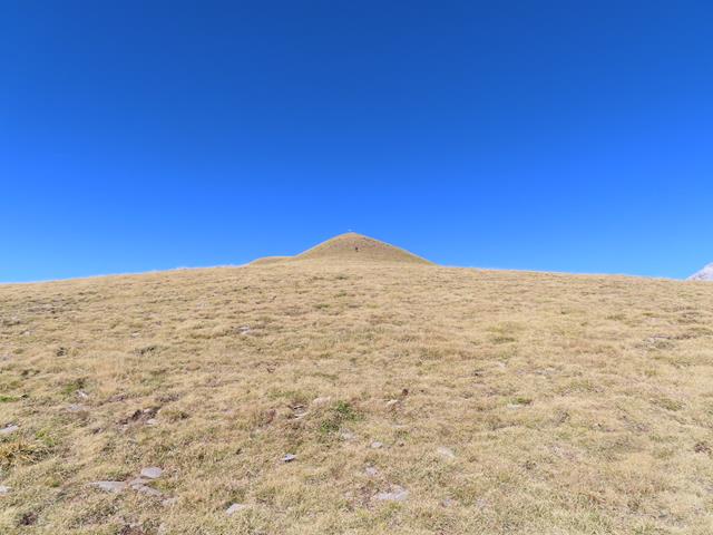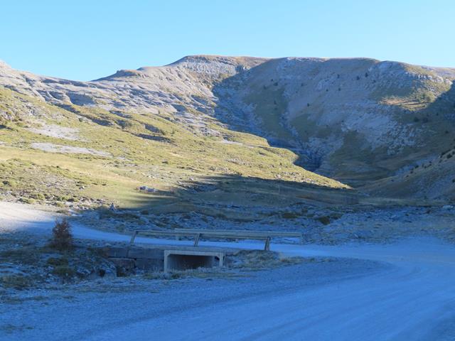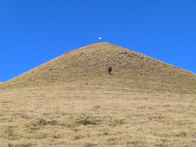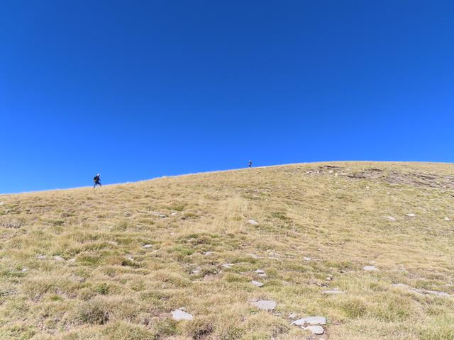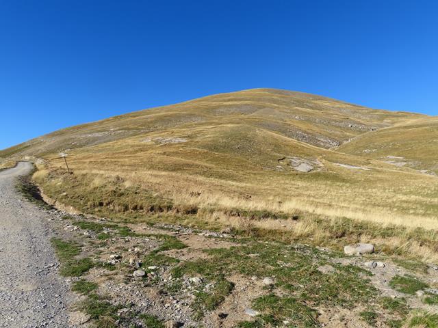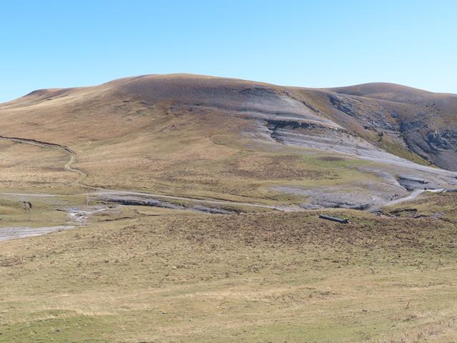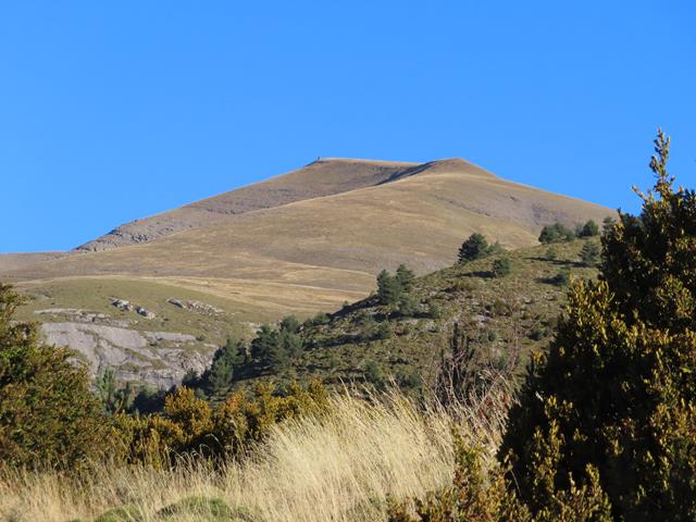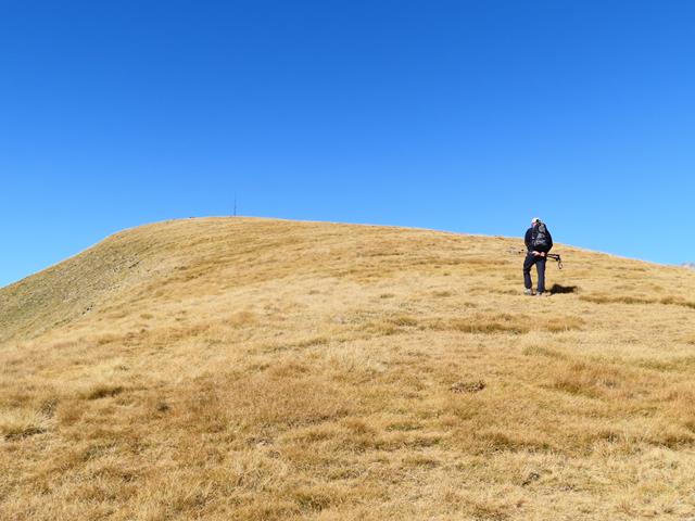 Vamos a iniciar el ascenso desde aquí, por la vertiente sur. Aparentemente parece muy fácil. Es como el lomo de un gran cetáceo, lleno de hierba marrón. Parece estar chupado. ¿Engañarán las apariencias? pronto lo sabremos. Son las 13:15 horas.
