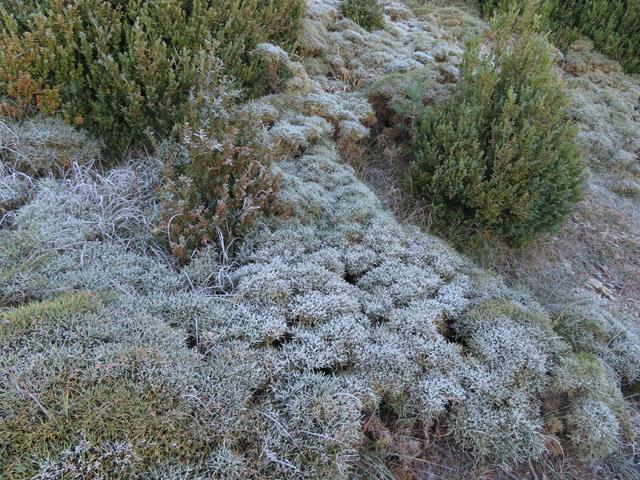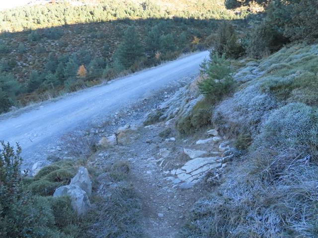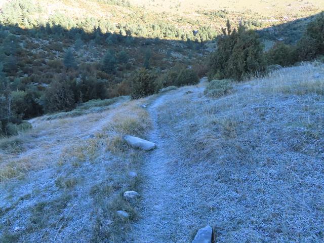 Ahora que entramos en zona zona de sombra, parte de la vegetación a ras de suelo y del camino presentan este manto blanquecino tan característico. Cuando pegue aquí el sol dentro de un rato, todo esto desaparecerá tal vez hasta la noche siguiente. La escarcha se produce cuando el rocío nocturno o gotas de vapor de agua, se condensa y se congela por las bajas temperaturas.