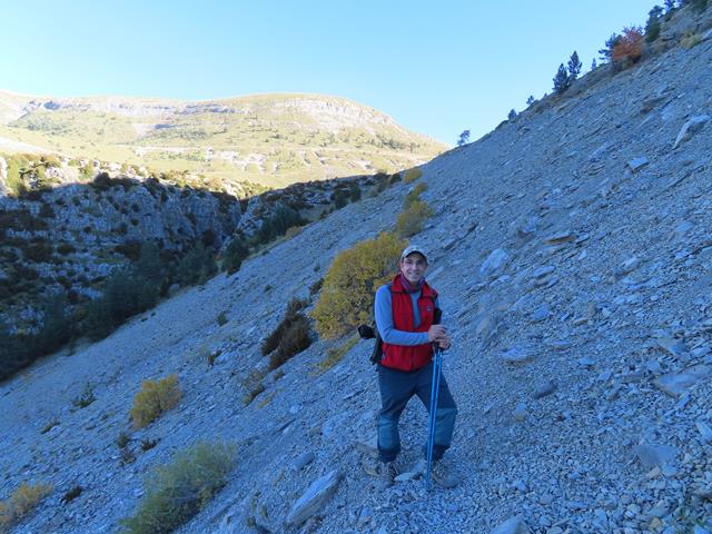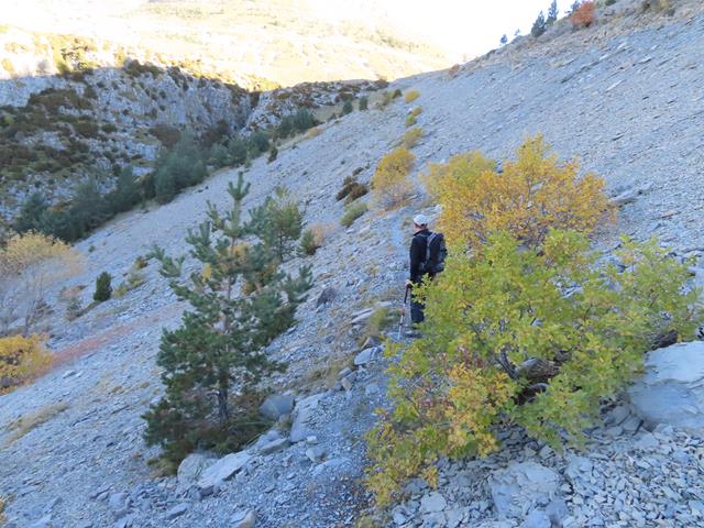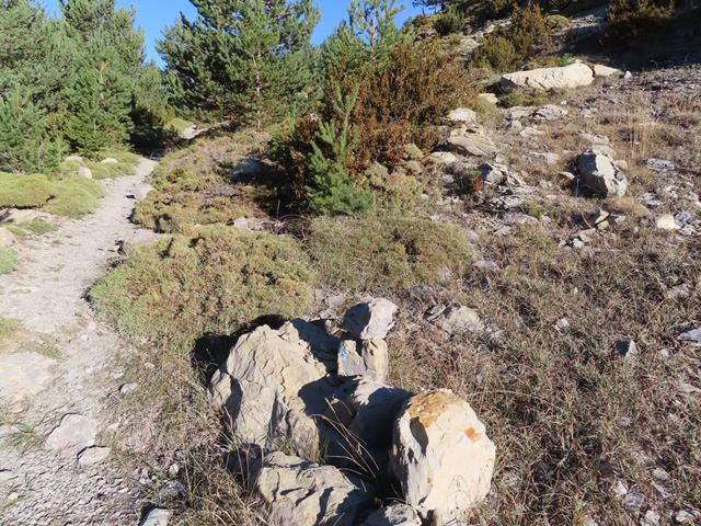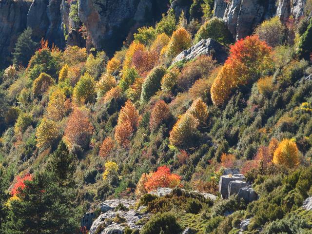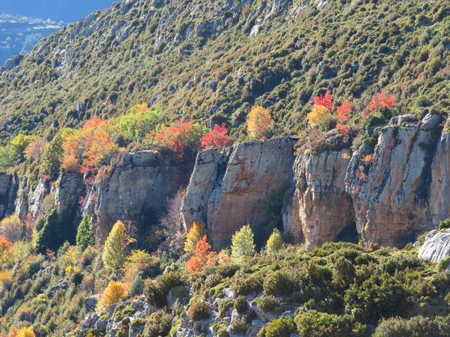 Una parte de la senda, tras dejar atrás los postes indicadores, cruza una ladera llena de piedras de todos los tamaños. Las más grandes llegan hasta abajo, las más pequeñas, por efecto de la gravedad y por su propio peso, se quedan más arriba. Algunos árboles caducifolios y arbustos han logrado arraigar en este entorno y ahora nos enseñan los colores del otoño.
