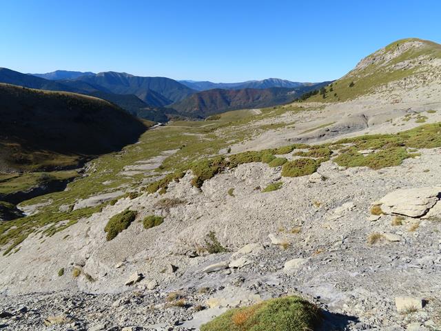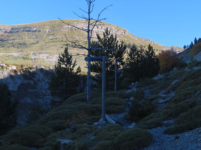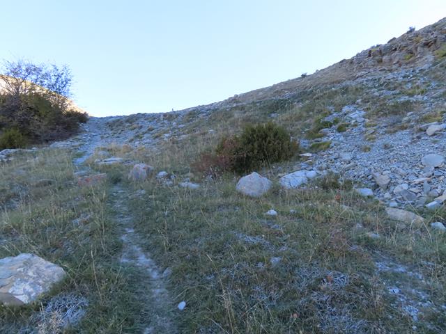 Tras caminar un trecho por estos parajes nos encontramos con un primer obstáculo que hay que salvar para seguir. Lo que no sabemos por dónde. Es una depresión en el terreno, que se ve en la foto de debajo, y que parece una zanja excavada en el terreno, tal vez por uno de los torrentes que bajan desde aquí.