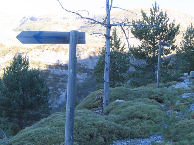 Tras 1,20 horas desde que comenzamos, y 3 km aproximadamente, llegamos a una zona donde hay unos postes señalizadores que nos indican una senda para llegar a la localidad de Fanlo. Evidentemente, los pasamos de largo. Otro indica Cuello Arenas. Aunque no hubiera carteles, con seguir hacia adelante la senda, sería suficiente. No hay pérdida.