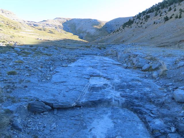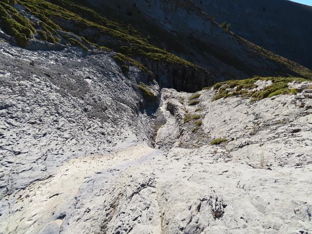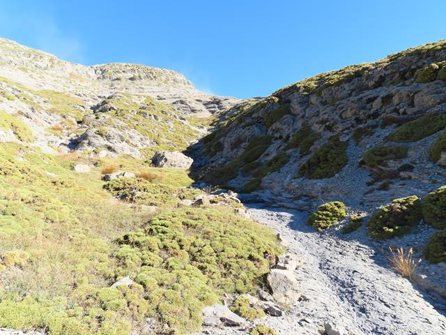 Ahora ya nos encontramos en un terreno absolutamente desconocido, pues ni siquiera en las guías aparece como una ruta hacia Cuello Arenas. No hay hitos, no hay senda. Sólo intuición. El torrente seco que salva más abajo el puente se nutre de otros varios que vienen de lo que parecen unos barrancos en abanico. En la foto de debajo se ve uno e ellos.