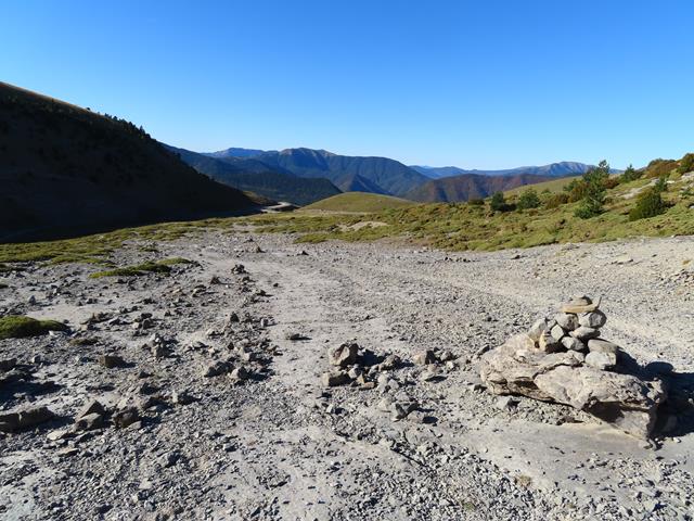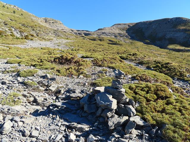 Estamos a 1.758 m. Hemos llegado a un puente que hace que la pista salve un torrente.Ahora hay que tomar una decisión. O seguimos la pista hasta llegar a Cuello Arenas, y desde ahí subir al Mondicieto, o nos dirigimos hacia la derecha, subiendo por el trazado del torrente y subimos la loma de la montaña y cruzamos las barranqueras. Un gran hito de piedras nos marca el inicio de la senda. Nos decidimos por esto último, aunque alarguemos un poco la excursión. No hay senda tras el primer hito ni ninguno más .Es campo a traviesa. Si no os apetece, seguid por la pista.