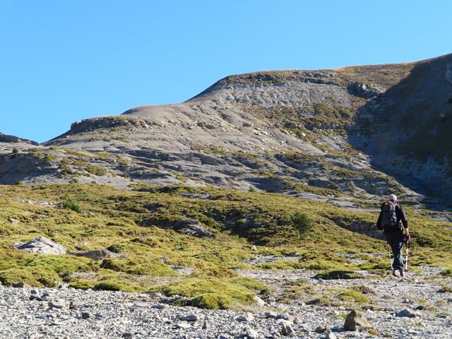 Pues bien, animados por intentar algo nuevo y desconocido nos adentramos en la depresión que nos llevará por una zona virgen- no hay senda alguna- hasta Cuello Arenas. Se trata de ir subiendo hasta llegar a nuestro objetivo.