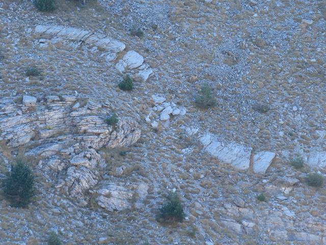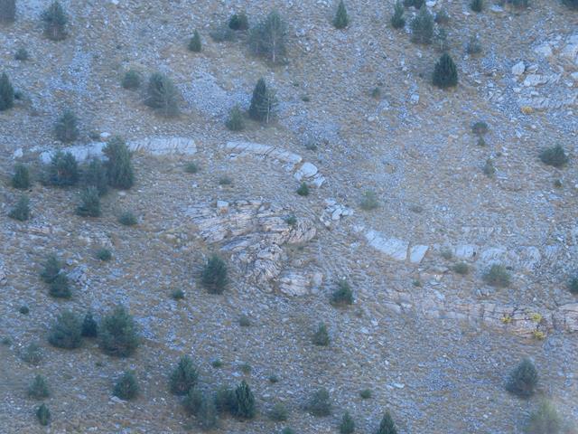 En las laderas de la montaña que tengo enfrente descubro unos estratos de roca que la erosión ha dejado al descubierto. Lo curioso de esto es que están doblados, plegados. Parecen anticlinales en rodilla. Desde luego las capas de sedimento han sufrido aquí unas presiones increíbles para dejarlas como se ven aquí ahora.