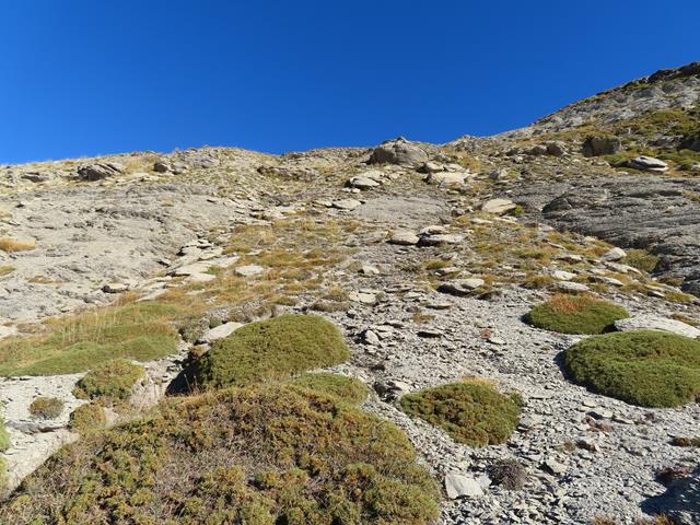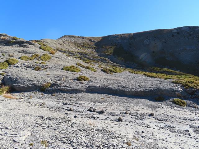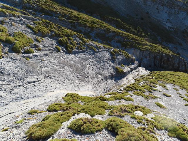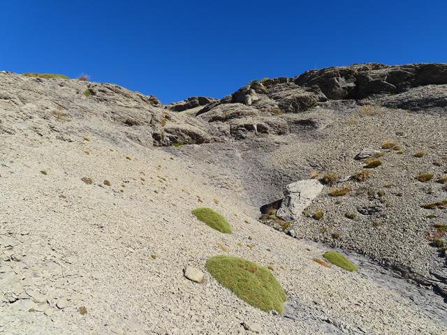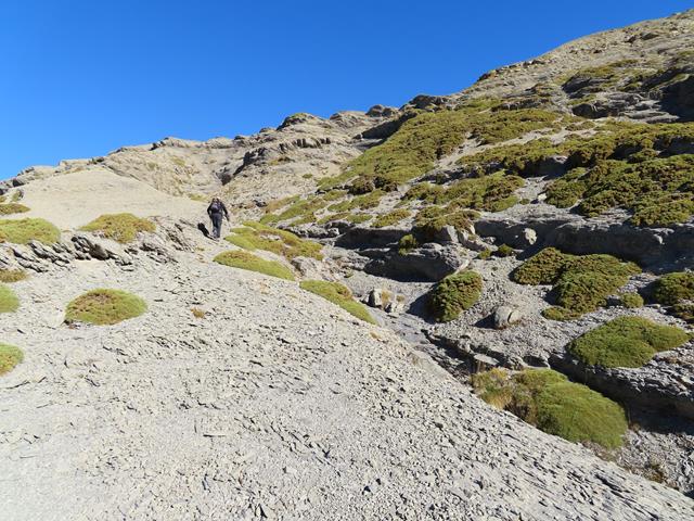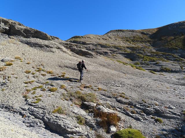 La sorteamos más adelante y ahora nos encontramos sobre un terreno de roca desmenuzada, que además cuando caminas sobre ella se desprende ladera abajo en grandes cantidades. Parecen rocas movedizas. Aquí apenas ha arraigado la vegetación.
