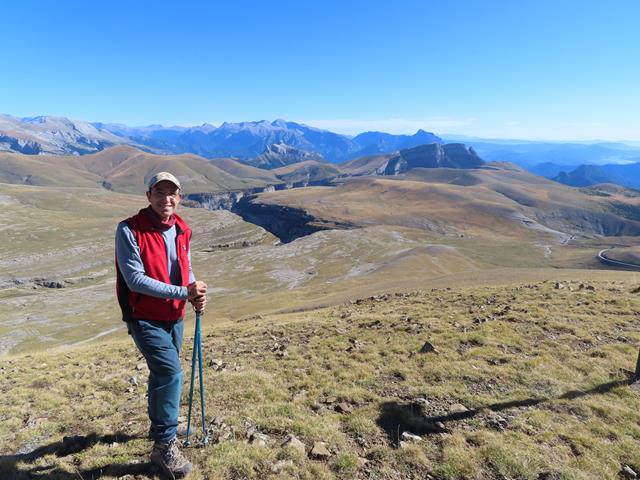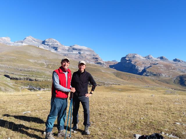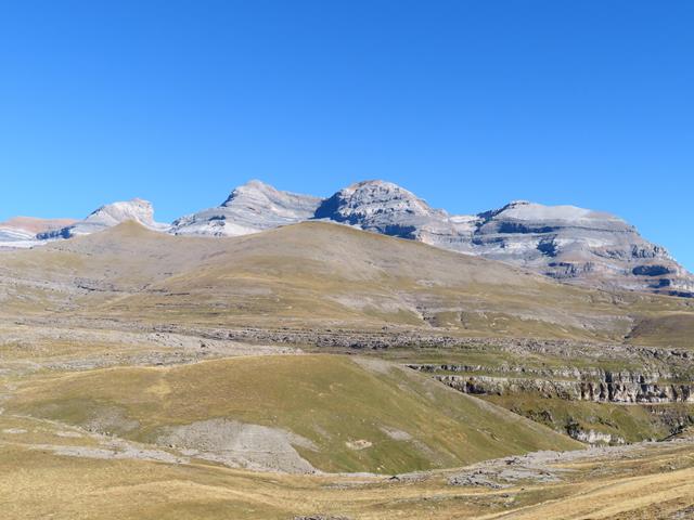 Desde aquí las vistas ya son impresionantes. Ante nosotros todo el macizo de Monte Perdido, las Tres Marías…y aún nos queda subir hasta la cima de La Estiva, donde aún se verá mucho mejor todo el entorno. Ha sido una buena idea improvisar, porque si llegamos a continuar por la pista todo esto no lo hubiéramos visto con tanto detalle.
