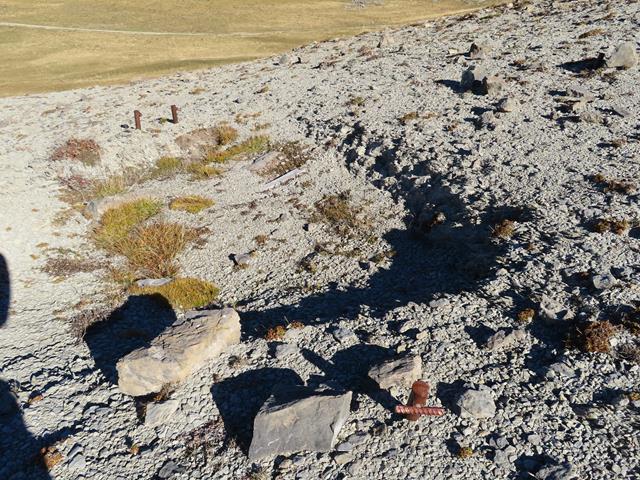 De subida nos encontramos con unos hierros clavados en la tierra. Son cuatro. Cada uno en la esquina de una especie de hueco o zanja rectangular. Cuál sería su función, y quién los colocó ahí es un misterio.