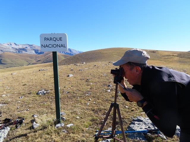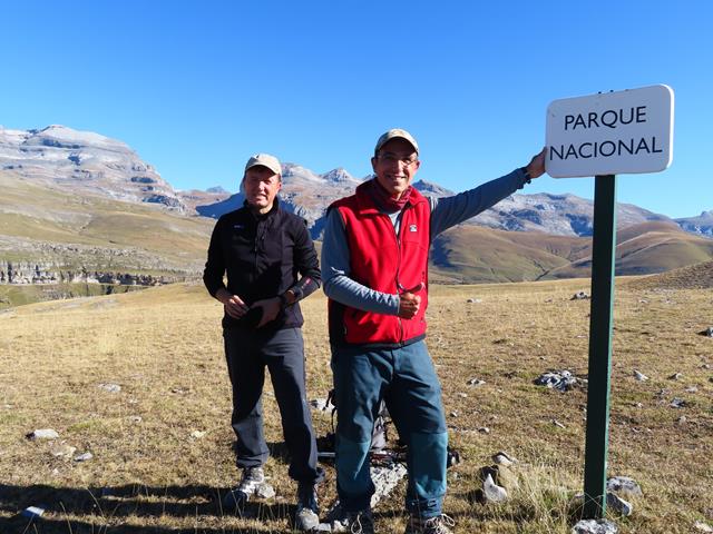 Después de hacer un montón de fotos mientras subíamos, llegamos al pico de la Estiva. Ya hemos salvado un desnivel desde Nerín de 726 m de altura. Son las 12 de la mañana. Llevamos tres horas de excursión. Hemos recorrido 5 km. Estamos en el Parque Nacional de Ordesa y Monte Perdido tal y como pone en un cartel que nos encontramos.