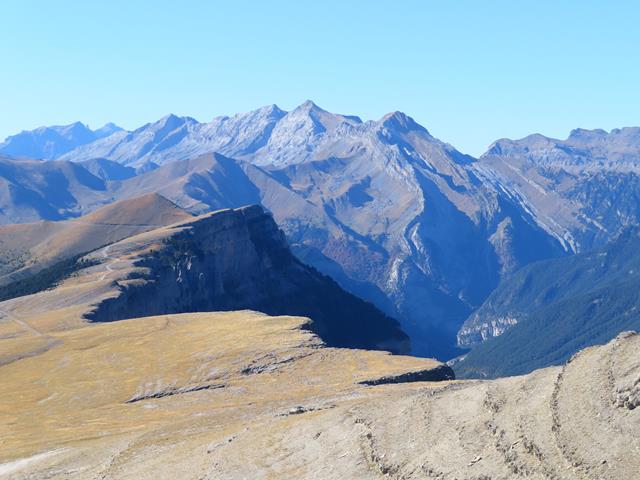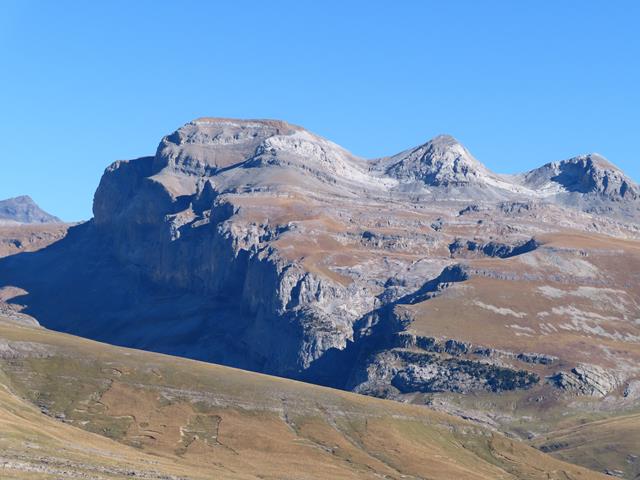 Bajo la línea de cumbres puede observarse el desarrollo de una muralla rocosa, la Faja de Pelay, bajo la cual discurre uno de los senderos más conocidos del parque nacional, la “Senda de los cazadores” y que yo hice hace años. El Pueyo Mondicieto (2384 m) es la cumbre más elevada de esta pequeña cordillera entallada entre los prodigiosos cañones de los ríos Arazas (Ordesa) y Añisclo.