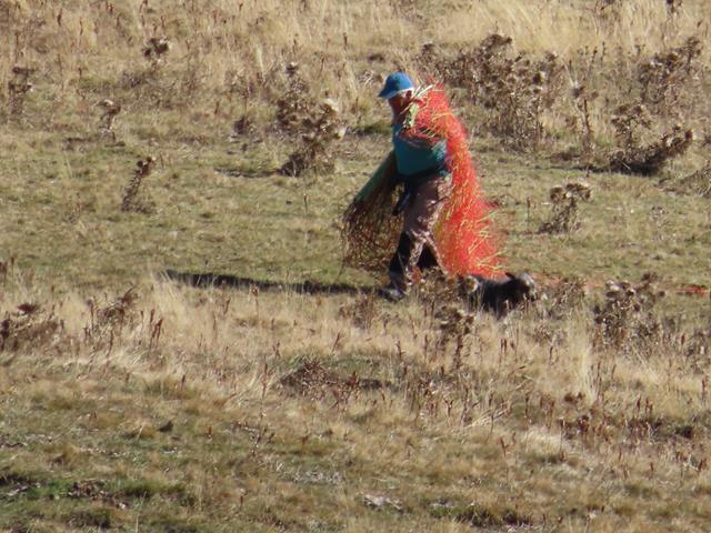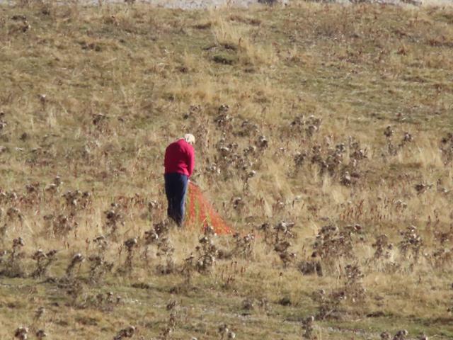 Llegamos a Cuello Arenas y desde aquí nos toca dirigirnos al Mondicieto pero no tomamos la pista. Vamos campo a traviesa para ahorrar tiempo. En la lejanía con el zoom fotografío a dos personas que arrastran lo que parecen redes naranjas, no sé lo que es.