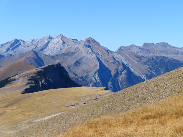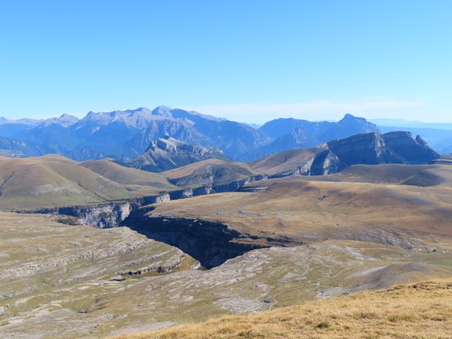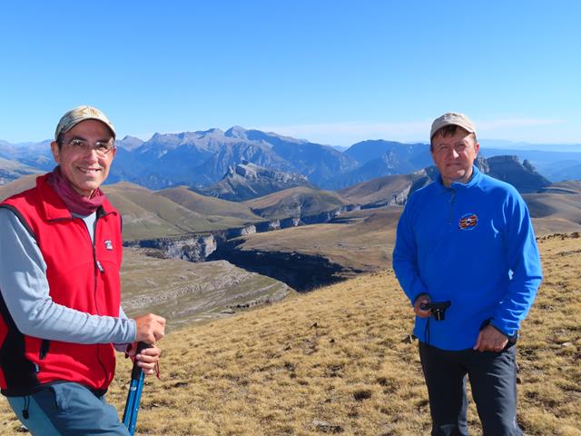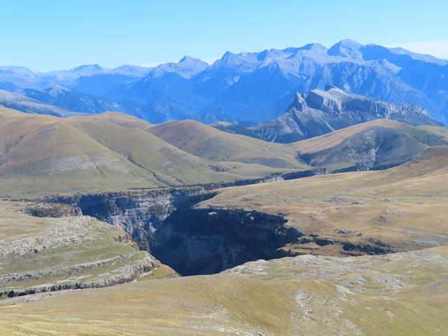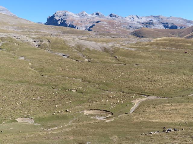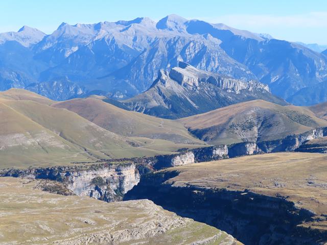 Pero ¿cómo no seguir haciendo fotos? es imposible, el paisaje es espectacular.En lafoto que os pongo debajo, toda la planicie de Cuello Arenas, La Estiva, y más al fondo aún, los Sestrales, sobre el Cañón de Añisclo, el Mondoto, Peña Montañesa…
