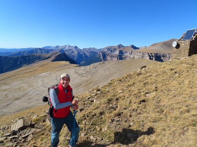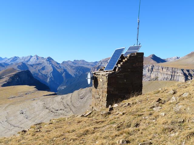 Ahora ya toca volver. El descenso, por el mismo camino, bueno, es un decir porque senda no hay. Nos dejaremos «caer» por la enorme loma. Son las 15:30 horas. Unas últimas fotos de recuerdo antes de descender; el pararrayos, la caseta con paneles solares, el cañón del rio Arazas -Ordesa-…no me canso de hacer fotos aquí.