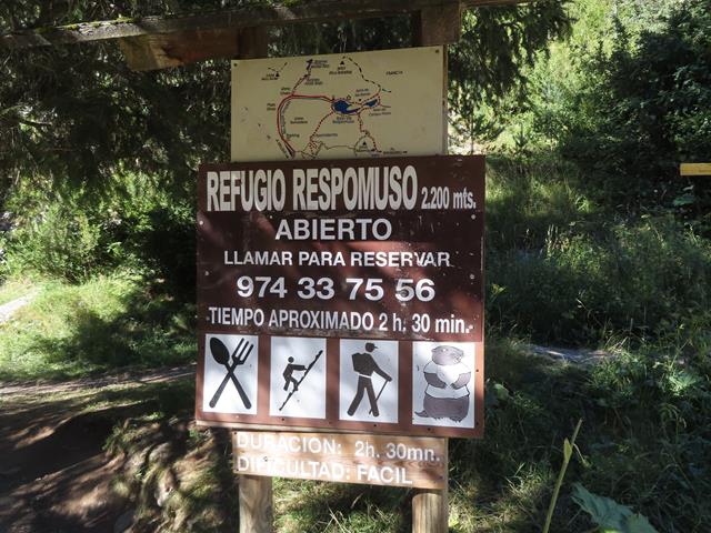 Uno de los paneles nos indica algunos datos sobre el conocido refugio de Respomuso, incluso nos da un teléfono para reservar la estancia, pero en cuanto al tiempo de llegada es un tanto impreciso, pues no son dos horas y media, sino mas bien una hora más yendo tranquilos. De todas formas, al menos utiliza la expresión «tiempo aproximado».