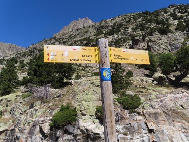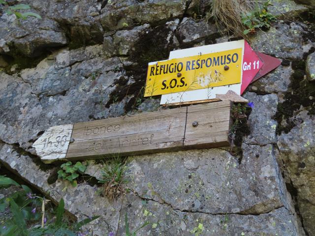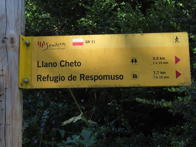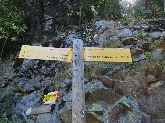 El letrero que indica el desvío a los ibones está hecho de madera y no se ve muy bien. Se nota que ha acusado el paso del tiempo. También el letrero que nos indica el refugio de Respumoso tiene algún desperfecto, dice que hay posibilidad de ayuda (S.O.S.) y bar, pero lo de bar, por alguna misteriosa razón, parece que lo han tachado.