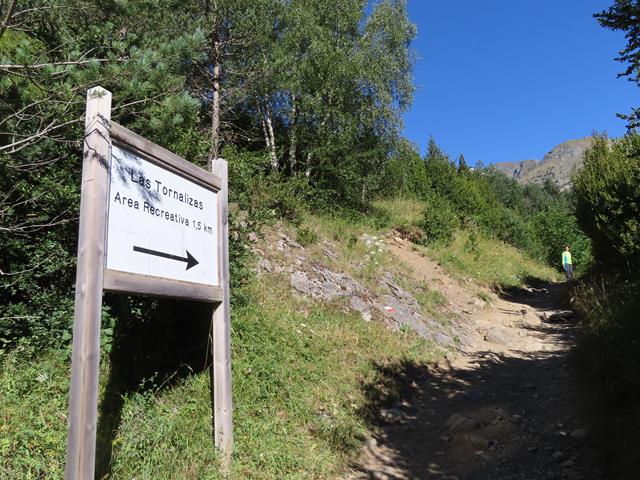 Otro de los paneles nos indica que a 1,5 km llegaremos hacia la zona recreativa de Las Tornalizas. Como os cuento, iremos remontando el río Aguas Limpias por su margen derecha, en suave ascenso por una senda cómoda y sin ningún tipo de dificultad. A medida que vamos caminando nos vamos encontrando con las pintadas rojiblancas del GR-11, sendero de gran recorrido que discurre por todo el Pirineo y que cubre en varias etapas.