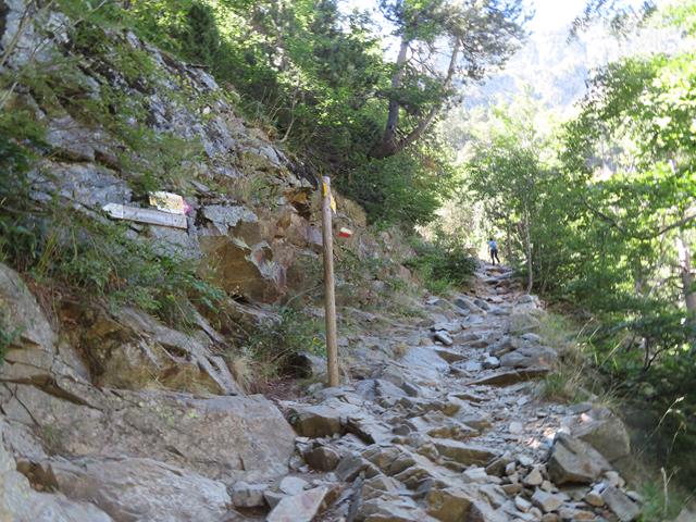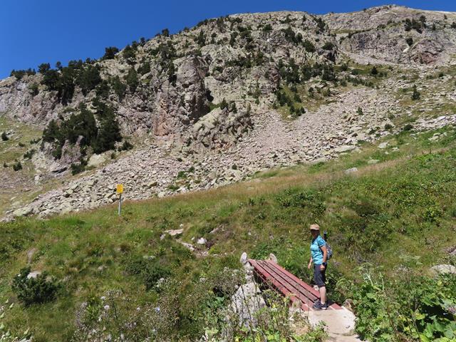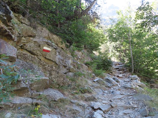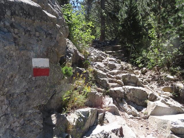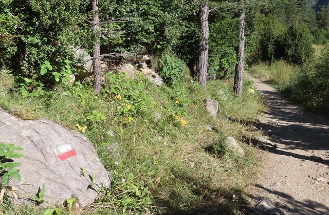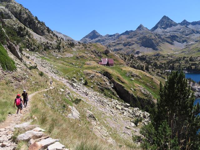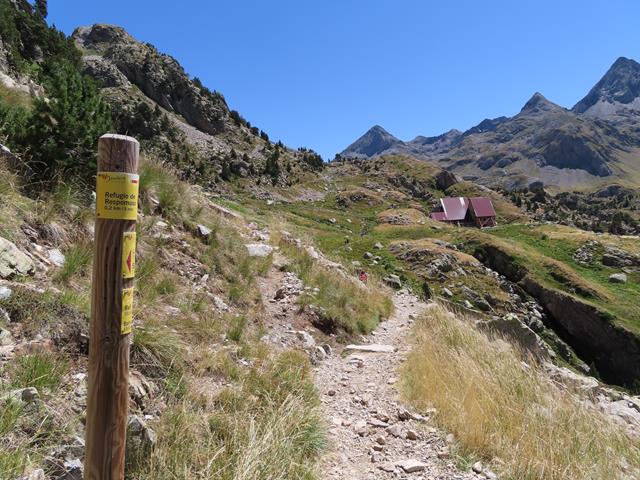 Ahora sólo queda caminar hasta el refugio donde comeremos y descansaremos un poco antes de emprender el regreso. Un poste con las marcas rojiblancas del GR-11 nos indica el camino. No confundirse aquí porque hay sendas que descienden y van más cerca del ibón. Estas no os llevarán al refugio.