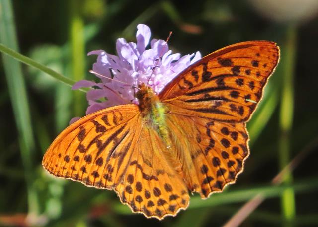 También veo una bonita mariposa de la especie Adipe (Argynis adippe) que suele vivir sobre violas en prados montanos. En este caso se está alimentando del polen de una flor llamada Botón azul (jasione crispa) que se suele ver crecer en pastos pedregosos de altura.