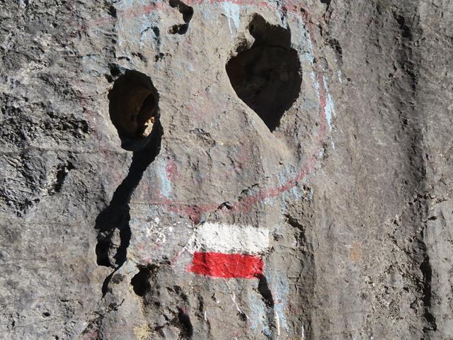 La temperatura es de unos 20 Cº a estas horas y el cielo está totalmente despejado. Seguimos viendo las marcas del GR-11, a veces sobre árboles, otras veces sobre rocas, pero faltar, no faltan. El camino, más bien una senda ancha, es cómodo y con buen firme al menos de momento.