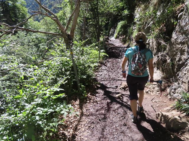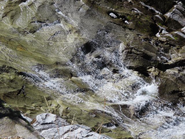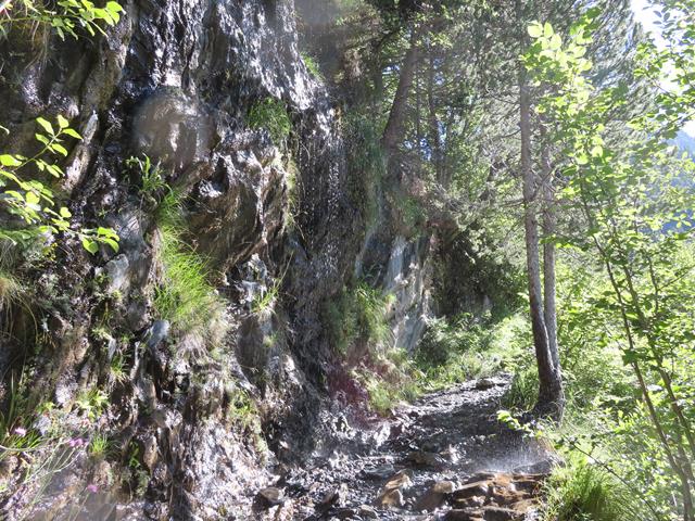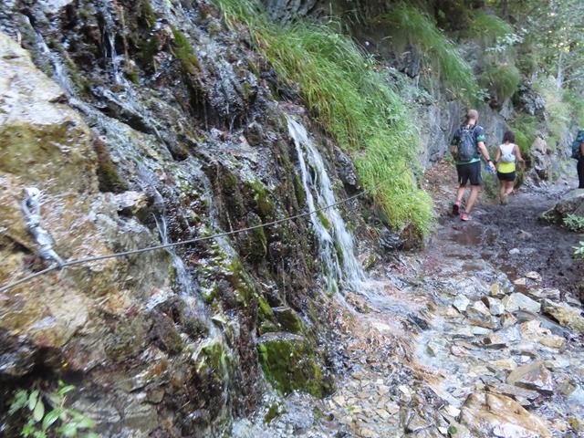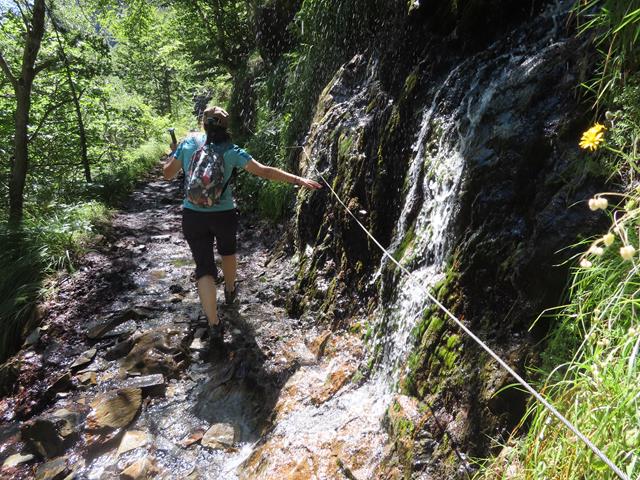 Pequeñas cascadas descienden hasta el camino, y una más grande es desviada sobre nuestras cabezas por un tubo de plástico que evita que el agua caiga directamente sobre los senderistas. De todas formas es inevitable mojarse un poco. Buen alivio para los días en que aprieta el calor. El suelo aquí está mojado, id con precaución para evitar resbalones.