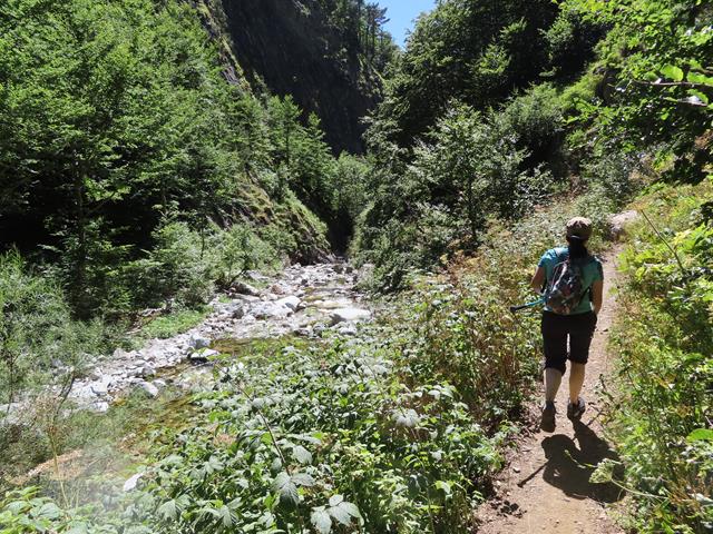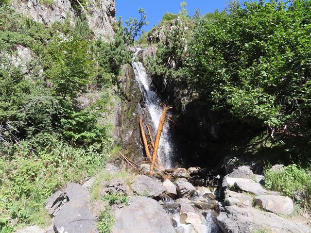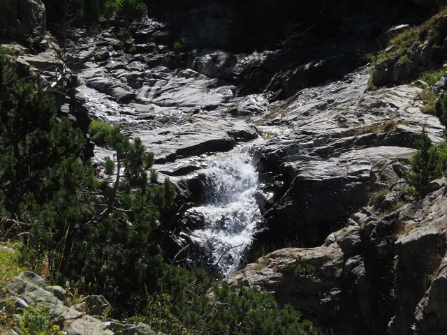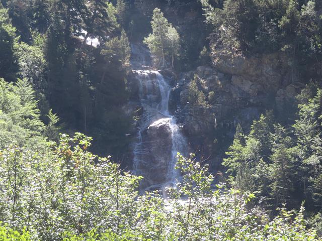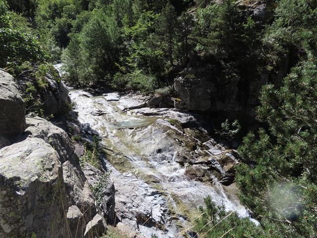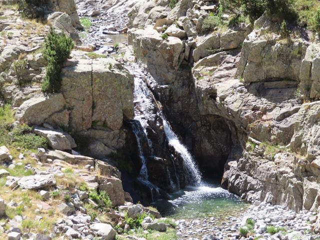 La más vistosa es la de Balsaroleta. Unos troncos de árboles están atascados en ella. Posiblemente se quedaron ahí tras ser arrastrados en la última crecida. Nos paramos un momento en el puentecillo que le sirve a la GR-11 para cruzar el barranco, sentimos el frescor del agua, y continuamos.