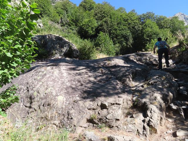 Siguiendo la senda me encuentro con una zona de rocas que me hablan de tiempos pasados. Para un aficionado a la geología como soy yo, no me pueden pasar desapercibidas. Son rocas aborregadas, se llaman así porque quedan redondeadas por la acción del pulimiento glaciar. Y es que hace miles de años por aquí descendía una lengua glaciar.