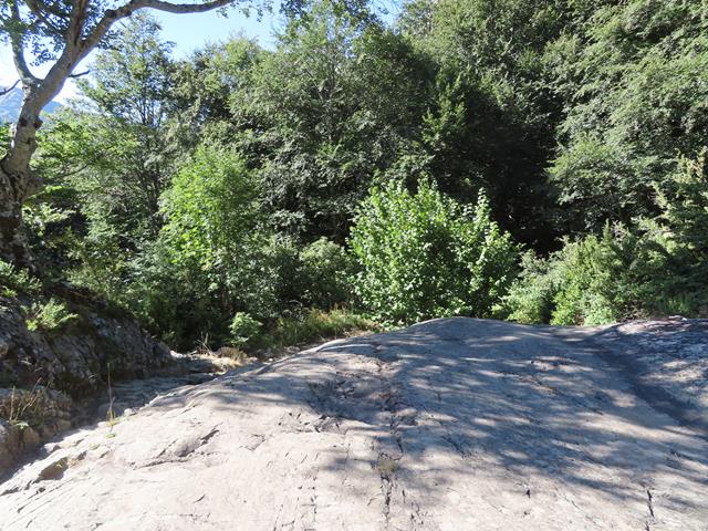 Un poco más adelante, paso caminando por encima de una estructura totalmente plana y de hormigón. Estoy a la altura de la presa, más o menos. Yo creo que ahí tendría que haber alguna construcción relacionada con la construcción de la presa, y que actualmente esta derruida quedando sólo el solado. Hasta ahora hemos salvado un desnivel de 740 m pero quedarán otros 80 m aproximadamente hasta llegar al refugio de Respomuso.