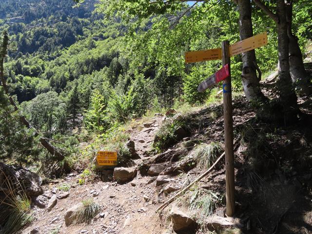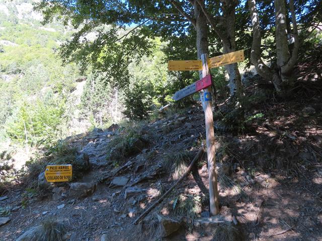 Tras una hora de caminata, llegamos a otro poste que nos indica la ruta a seguir para llegar al pico de Arriel (2.824 m). Curiosamente también hay otro cartel indicando que éste no es el camino para llegar a los ibones de Arriel. Aclaración necesaria y útil ya que la gente solía equivocarse.
