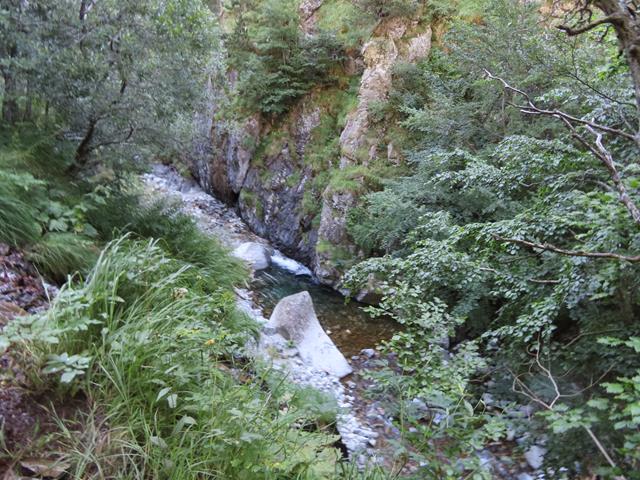 Con cuidado, alargo el brazo por encima de la sirga y hago una foto del fondo el desfiladero para que os hagáis una idea de la altura. No es que sea demasiada, pero una caída desde luego tendría consecuencias fatales.