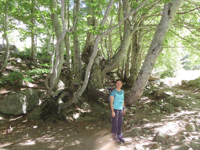 De nuevo aparecen las marcas de la GR-11, y caminamos también de nuevo entre hayedos. Algunos árboles han adquirido formas curiosas y singulares, como un haya que parece tener múltiples tentáculos como si fuera un gran pulpo.