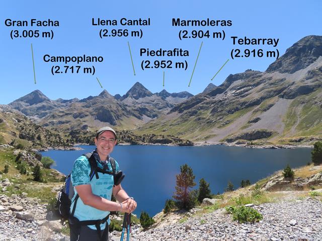 Como no podía ser menos, me hago la foto de rigor con el fondo de todos los picos que se ven desde aquí en el circo de Piedrafita. Os pongo los nombres y la altitud en la foto de debajo.