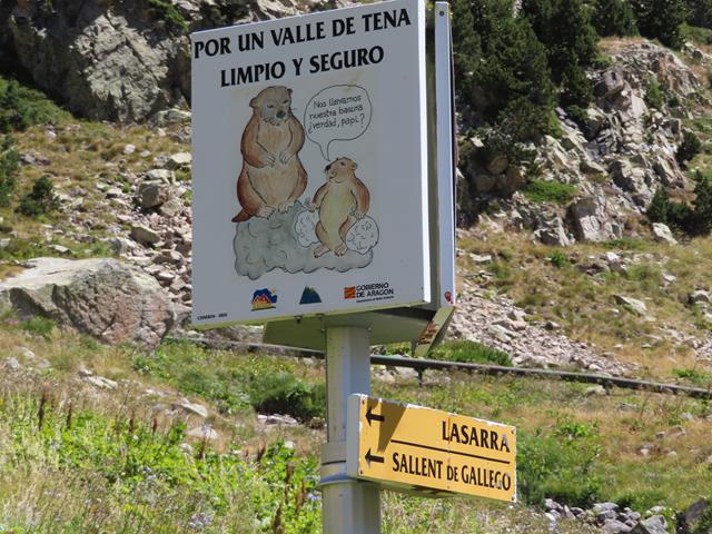 Un simpático cartel con dos marmotas pide que se deje el entorno limpio. Una marmota que lleva una bolsa de basura en cada mano le dice a la otra: «Nos llevamos nuestra basura ¿verdad Papi?».