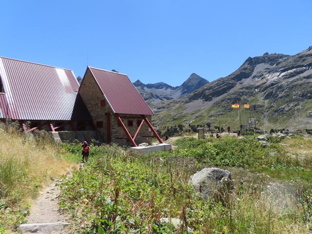 Y por fin, en torno a las tres horas de marcha desde que comenzamos, llegamos al refugio. Junto a él, hay dos banderas ondeando, la de Aragón y la de España. Y también hay bastante gente.