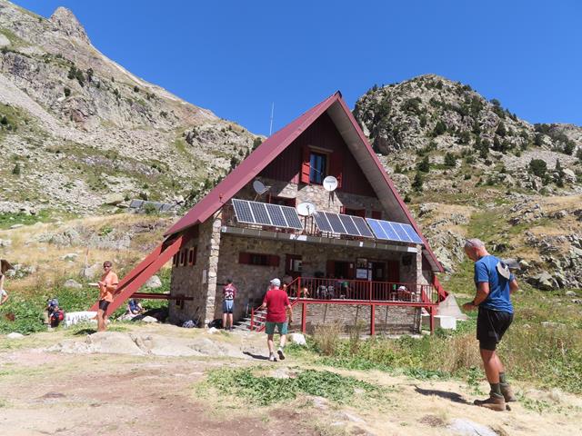 Una vez allí, y en la explanada que hay delante del edificio, nos disponemos a comer. Vemos gente que sale con jarras de cerveza y con platos de comida. La procedencia de la gente por aquí es variopinta, de España por ejemplo vascos (les oigo hablar) también hay muchos franceses, e incluso un hombre y una mujer estadounidenses (lo sé porque les pedí una foto y me lo dijeron). Hay algunos que están comiendo bajo la cornisa del refugio, junto a la barandilla, a la sombra, para guarecerse del calor.
