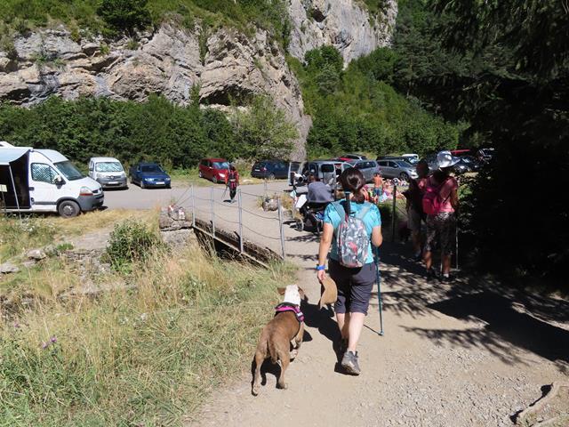Llegamos con el coche hasta las inmediaciones del merendero – es un edificio en toda regla, el «Asador La Sarra» con bar, terraza, servicio de cocina etc, no son cuatro bancos de madera a la sombra- y como era de suponer, no cabe «una aguja en un pajar» en cuanto a vehículos se refiere. Estamos en agosto. Como no puedo aparcar me tengo que buscar la vida y al final lo logro pero en un lateral de la carretera, entre la central hidroeléctrica y el merendero. No importa, sólo tendremos que caminar un poco más hasta el inicio del sendero.