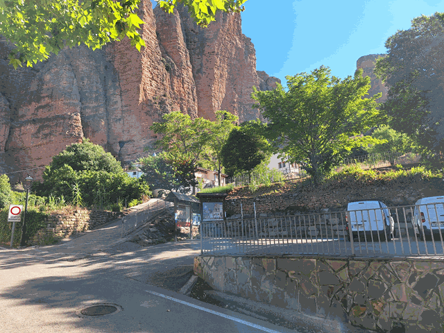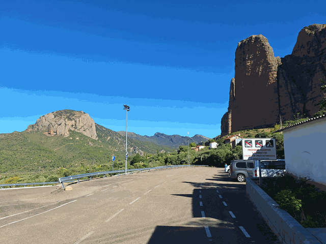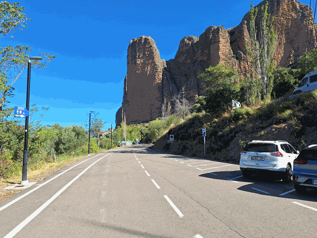 Ya una vez allí, al entrar al pueblo, te desvían directamente hacia un amplio parking que queda a mano izquierda y que es de pago. Desde enero de 2023 el Ayuntamiento de Riglos aplica una tasa por estacionamiento de vehículos de 3 euros. Esto te da derecho a dejar el coche todo el día. Hay espacio de sobras en dos esplanadas repartidas en dos alturas (parking 1 y 2). El pago se efectúa en una máquina situada junto al aparcamiento y el ticket se debe dejar bien visible en el salpicadero.