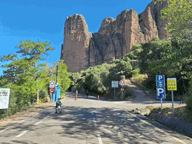 Seguimos avanzando y ahora llegamos a otro aparcamiento, el P3, en el que sólo pueden aparcar autocaravanas, camper y vehículos de ese estilo, es también de pago. Si vais con este medio de transporte, este es vuestro sitio. Al frente, una señal que prohíbe la circulación salvo para residentes y vehículos autorizados. Desde luego, se han molestado en regular el aparcamiento en Riglos con todo lujo de detalles.