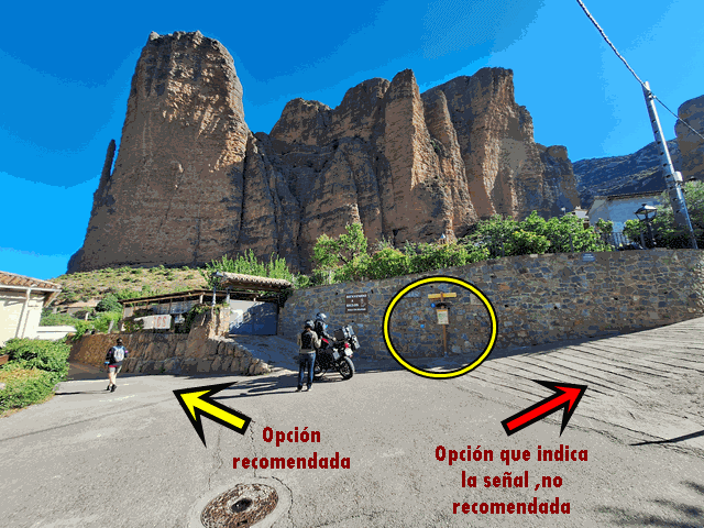 Una vez hemos pasado el aparcamiento tres (P3) que queda a mano derecha, seguimos avanzando hacia lo que sería propiamente parte del casco urbano de Riglos. Dejamos a la izquierda una casa con un bar-terraza.
