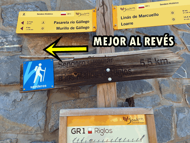A medida que avanzamos y a la izquierda, nos encontramos de nuevo con un poste de dirección y un camino que va de bajada, también a la izquierda. No hacer caso de ninguno de los dos y seguir recto. Una de las señales nos indica como llegar desde Riglos al Pantano de la Peña por la Foz de Escalete, es una ruta del PR-HU 96 (sendero de pequeño recorrido de Huesca), y ésta sí señala en nuestra misma dirección, pero es porque coincidirá en un breve tramo con el nuestro.