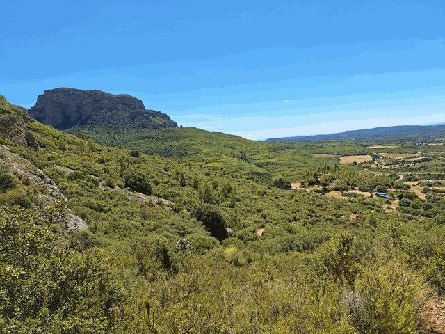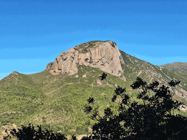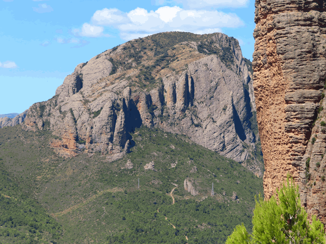 Mas a la izquierda, tampoco hay que despreciar la vista de Peña Rueba, a estas horas bien iluminada por el sol. Es una mole de conglomerado de similares características a los Mallos de Riglos, separada de ellos por el río Gállego. Presenta escarpes por todas sus vertientes con farallones que llegan a superar los 200 m de altura y por los que también se han abierto vías de escalada.