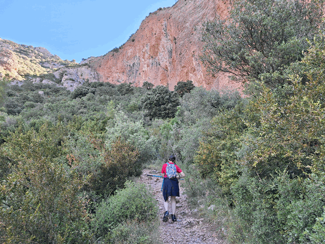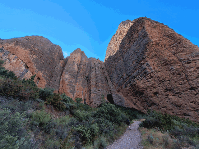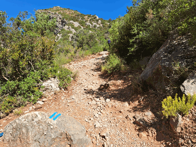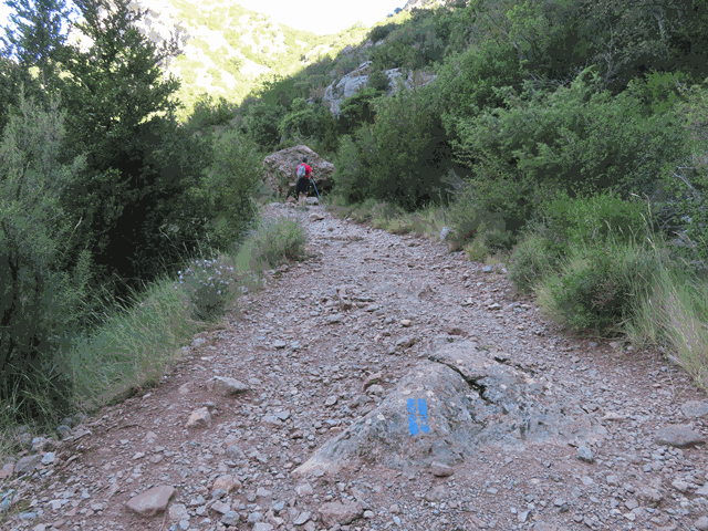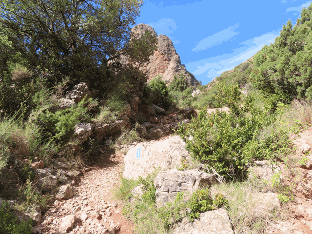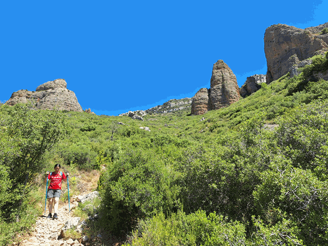 Seguimos subiendo a la sombra de los grandes mallos por la senda que sigue presentando abundante gravilla y piedra suelta. Marcas azules pintadas en las rocas nos siguen indicando la dirección.